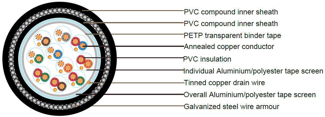 Conductor Annealed or tinned copper, sizes: 0.5mm² and 0.75mm² mulitistranded(Class 5), 1.5mm² multistranded(Class 2) to BS6360 Insulation PVC (polyvinyl chloride),type TI1 to BS 6746 Pairing Two insulated conductors uniformly twisted together with a lay not exceeding 100mm Colour code Multipair cables:See technical information Individual screen Aluminium/polyester tape is applied over each pair metallic side down in contact with tinned copper drain wire, 0.5mm² Binder tape PETP transparent tape Collective screen Aluminium/polyester tape is applied over the laid up pairs metallic side down in contact with tinned copper drain wire, 0.5mm² Inner Sheath PVC (polyvinyl chloride), type TM 1 to BS 6746 Amour Galvanized steel wire armour Outer sheath PVC Sheath, type TM 1 or type 6 to BS 6746 Sheath colour Black or blue -